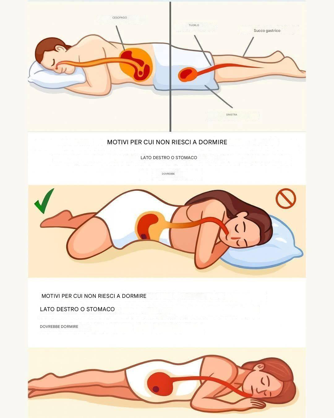 Dormire sulla schiena o sul fianco destro, invece, può peggiorare il reflusso acido perché in queste posizioni lo stomaco è più in alto dell’esofago.
