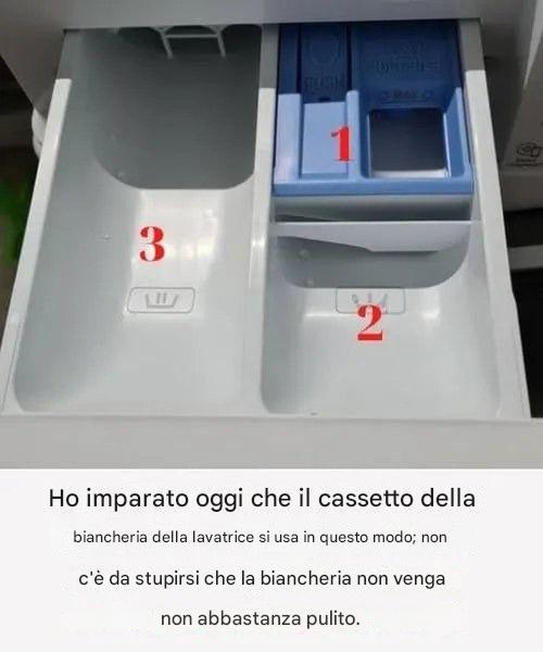 Come molti, versavo il detersivo direttamente nel cestello, impedendo alla macchina di distribuirlo correttamente. Versandolo nella vaschetta del detersivo, si scioglie in modo uniforme, garantendo che il sapone raggiunga ogni fibra del bucato al momento giusto.