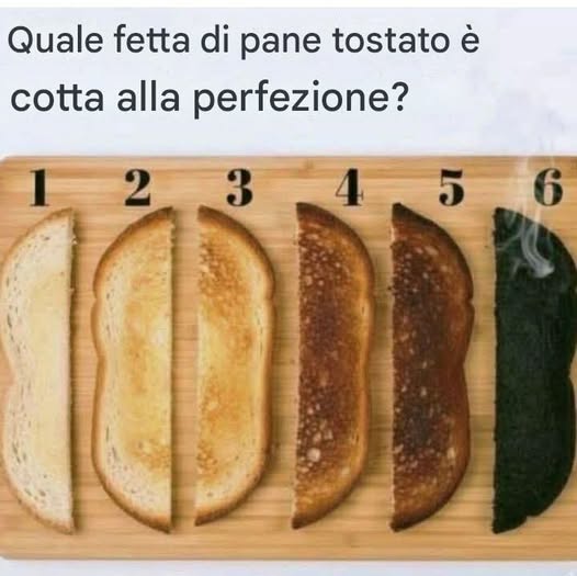 A prima vista, l’immagine sembra semplice: sei fette di pane tostato, disposte ordinatamente e numerate da 1 a 6, ognuna delle quali rappresenta un diverso livello di cottura. La fetta numero 1 è appena tostata, pallida e morbida, mentre la fetta numero 6 è completamente bruciata, scura e fumante. La domanda sopra l’immagine – « Quale fetta di pane tostato è cotta alla perfezione? » – sembra giocosa, eppure invita a una riflessione sorprendentemente profonda.