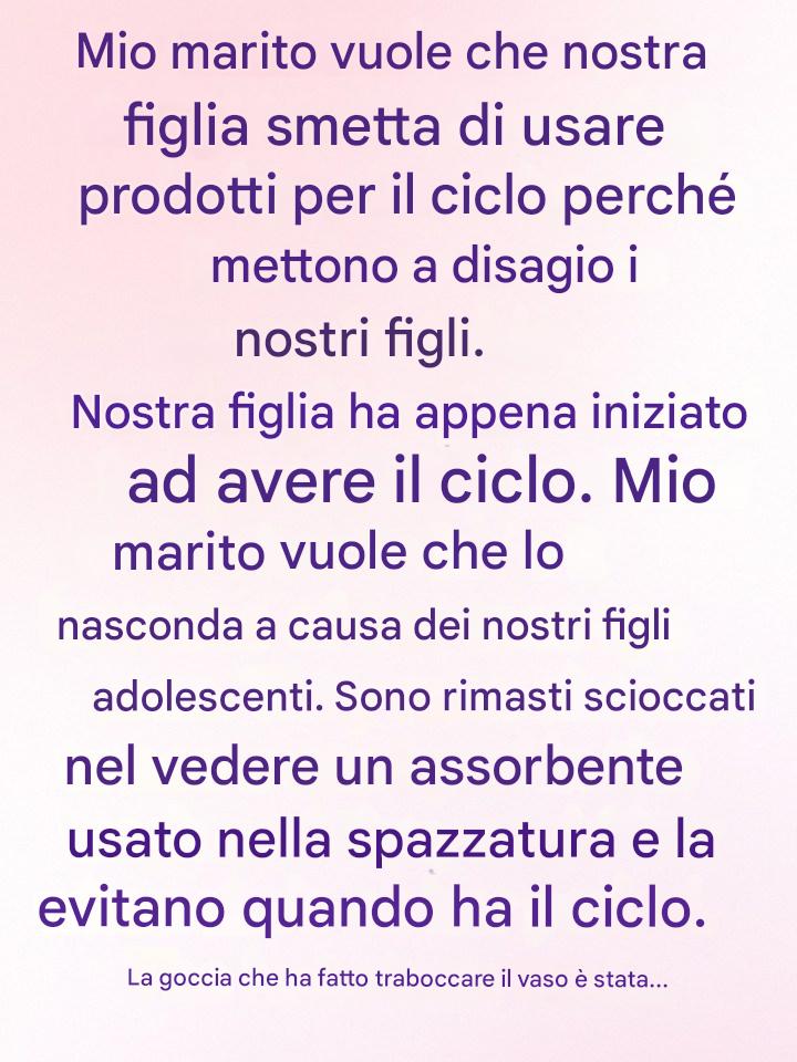 La goccia che ha fatto traboccare il vaso è arrivata ieri sera... quando lui le ha suggerito di rimanere nella sua stanza finché non le fosse finito il ciclo, così i ragazzi non si sarebbero "sentiti a disagio".